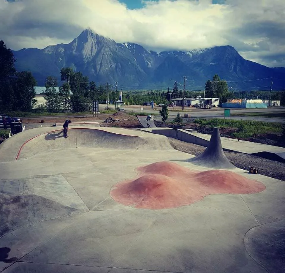 With a street lane, mini ramp, and open flow zone, this layout can accommodate all styles and attracts riders across northern BC. Several elements are themed to incorporate traditional culture like the salmon egg and weir features, fish tail ramp, frog and fireweed iconography.