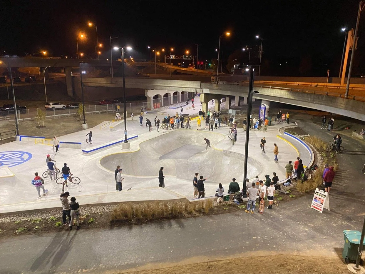 Phase 1 of this project consisted of an advanced flow bowl and a terracing plaza which descends from a new multi-use pathway down to a covered street style lane beneath the bridge. Artistic details are incorporated to reflect the history of the site, with future phase connections considered in the preliminary design to allow the skatepark to easily expand in Phase 2.